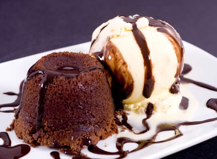 Sobremesa composta de um bolo de chocolate com casca crocante e recheio cremoso